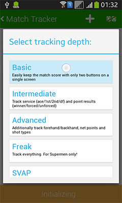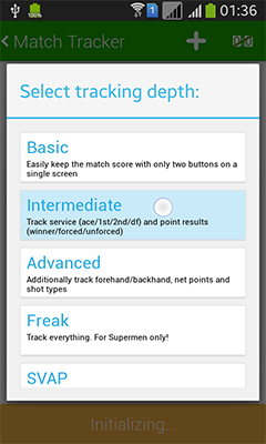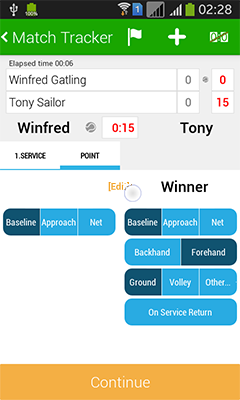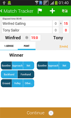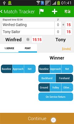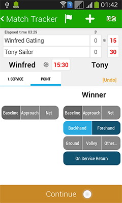 The point outcome is known and the score has been changed. You can now enter some additional info about the point. Tracking Depth defines the amount of options you see on this screen. You enter the values and confirm with the "Continue" button.