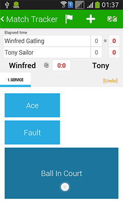 Enter the service outcome (one of Ace / Fault / Ball in Court). Assuming the service was successful: press the huge "Ball in Court" button.
