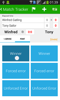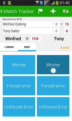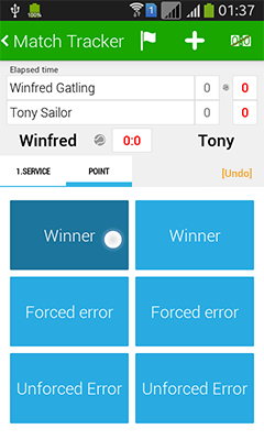 Now the ball is in play and you select the outcome of the point. Either player may make a Winner or an Error of a kind. Let's press "Winner" for the serving player.