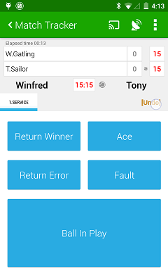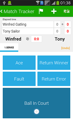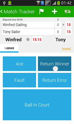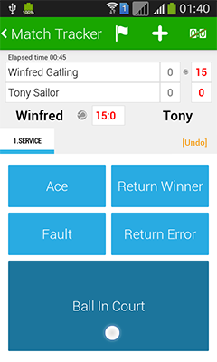 Now you have more options. Enter the service outcome (one of Ace / Fault / Ball in Court / Return Winner / Return Error). Assuming the service was successful: press the huge "Ball in Court" button.